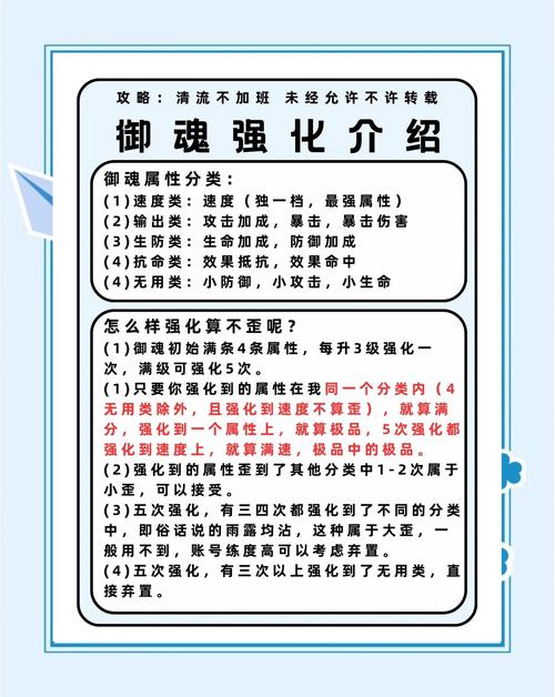 〖伍〗、属性提升方法:洗练:通过消耗洗练材料,随机改变御魂的属性,从而可能提高属性总和。升级:消耗御魂升级材料,提升御魂等级,增加属性总和。突破:消耗突破材料,提升御魂的等级上限,从而允许御魂继续升级并增加属性总和。强化:通过消耗强化材料,直接提升御魂的属性值。