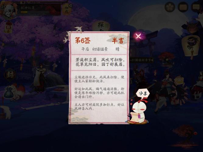 〖叁〗、在阴阳师中购买账号时,主要应考虑以下几个方面: 招财一速的速度 重要性:招财一速是衡量账号质量的重要指标之一,特别是在斗技等PVP玩法中,速度快的招财式神能够先手行动,为队伍带来优势。关注点:查看账号中招财御魂的比较高速度值,速度越快,账号在PVP中的竞争力越强。