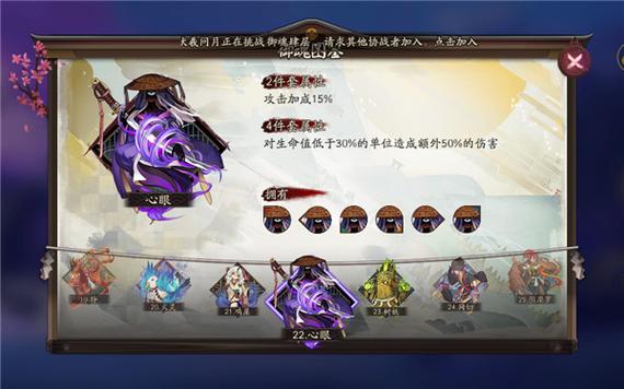 搭配推荐: 式神推荐:心眼御魂适合搭配那些擅长收割残血的式神,如茨木童子、鬼使黑、白狼等。这些式神在敌人生命值较低时能够发挥更大的伤害输出。 属性搭配:心眼御魂的2件套属性提供攻击加成15%,4件套属性则是对生命值低于30%的单位额外造成50%的伤害。