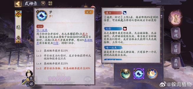 〖贰〗、阴阳师中的“效果命中”是指友方式神释放debuff时的命中概率,它影响式神的控制几率。以下是关于效果命中的详细解释:定义与作用:效果命中决定了式神释放的控制类技能能否成功作用于目标。高效果命中可以增加技能的控制成功率,从而在战斗中取得优势。计算公式:基础概率X。