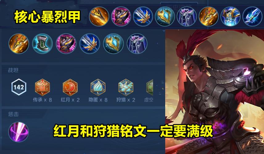 战神之怒:大招,提供免疫控制效果和增加防御能力,是团战中生存和输出的关键。出装与铭文选取 出装:推荐选取增加生命值和防御能力的装备,如“红莲斗篷”和“不祥征兆”,以增强吕布的生存能力。铭文:选取增加物理攻击和生命偷取的铭文,提高吕布的输出和续航能力。
