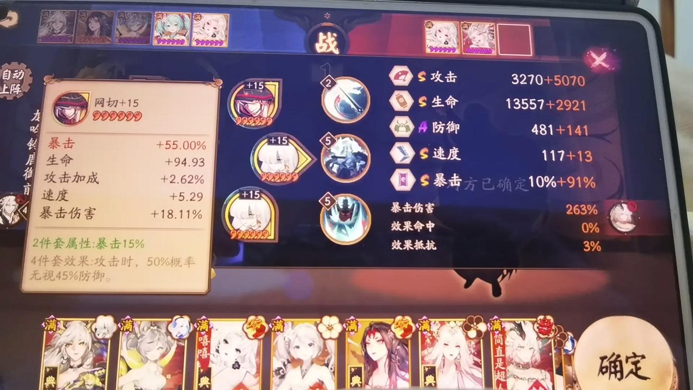 六号位六星暴击御魂:选取六号位为六星暴击属性的御魂,可以大幅提升暴击率。如果没有六星暴击御魂,五星的也可以作为过渡使用。追求满暴击:在确保六号位为暴击御魂的前提下,通过其他位置的御魂副属性来增加暴击率,直到达到100%暴击率。这是堆暴击的最基本要求。