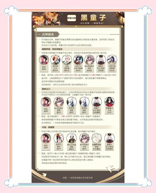 阴阳师黑童子阵容推荐搭配为:镰鼬+山兔+座敷童子+茨木童子+黑童子,阴阳师选取晴明。以下是对该阵容的详细解析:阵容核心思路 该阵容以高速控制和输出为核心,镰鼬和山兔能够提供稳定的拉条和减速效果,确保队伍能够先手行动,同时控制敌人。座敷童子则负责提供充足的鬼火,确保队伍技能的连续释放。