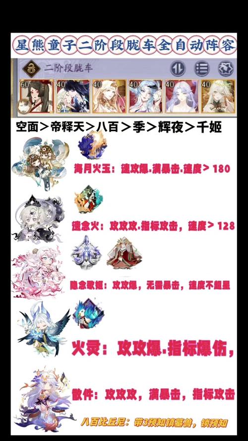 〖贰〗、高分阵容搭配推荐,以千姬、清明、麓丸、SP面、帝释天、缚姬为主力式神。第一种搭配方案:以千姬插贝戟后进行普攻,其余式神使用妖术标记敌方,晴明负责先灭后星。在精英阶段,将莲花技能传递给正确的呱太,呱太阶段结束后,再将莲花技能转给boss。