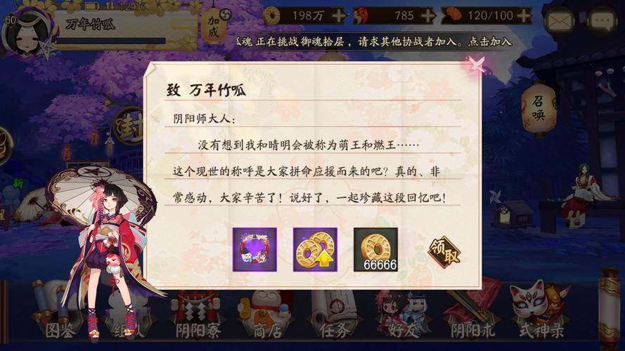 〖陆〗、每天协战50次获得50勾,这最容易被玩家遗忘。可以去世界频道找人做协战互换,也可以开3个小号来完成该任务。结界突破,突破3次5勾玉,9次全部通过10再奖励勾玉。如果不是大佬,比较好3次3次的通关比较好,因为谁也说不准一定能打过9个玩家。