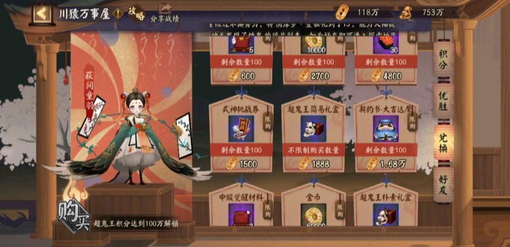 〖肆〗、超鬼王积分:近来体验服的超鬼王商店包含活动中经常有的1-5星白蛋、黑蛋、勾玉、蓝票、皮肤券、SP皮肤券、SSR/SP式神召唤券、椒图的春樱日和皮肤以及不同等级的超鬼王战功礼盒等,SSR/SP式神召唤券与椒图的春樱日和皮肤需要200万战功解锁,分别花费48万积分与98万积分兑换。
