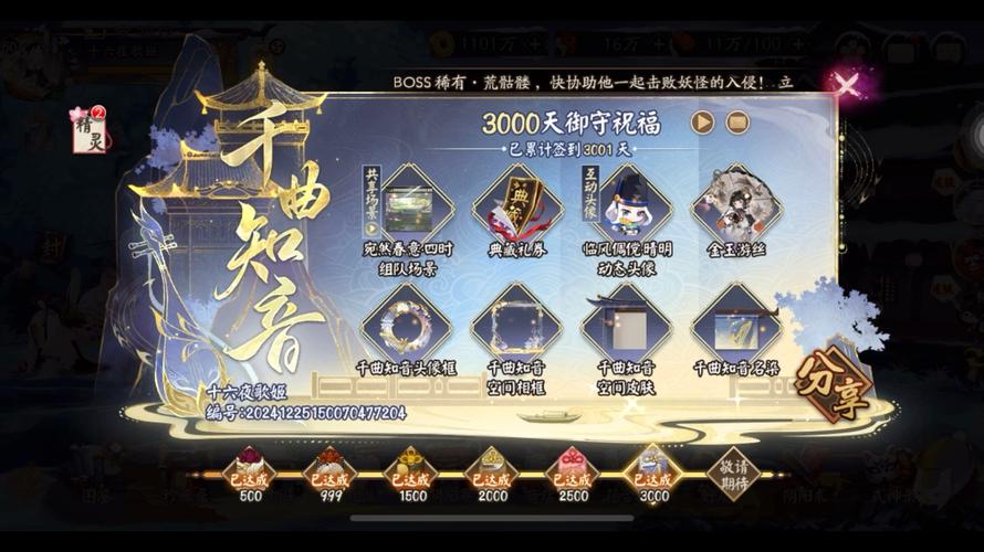 阴阳师签到3000天奖励 3000天签到成就专享礼将于10月30日维护后正式开放,达成该成就的玩家可以领取以下奖励:神乐限定皮肤「金玉游丝」限定组队场景「宛然春意·四时」可在【装饰 组队场景】处切换装扮。使用该场景加入队伍时将拥有专属入场特效,开启共享功能后其他队友也可以使用背景。