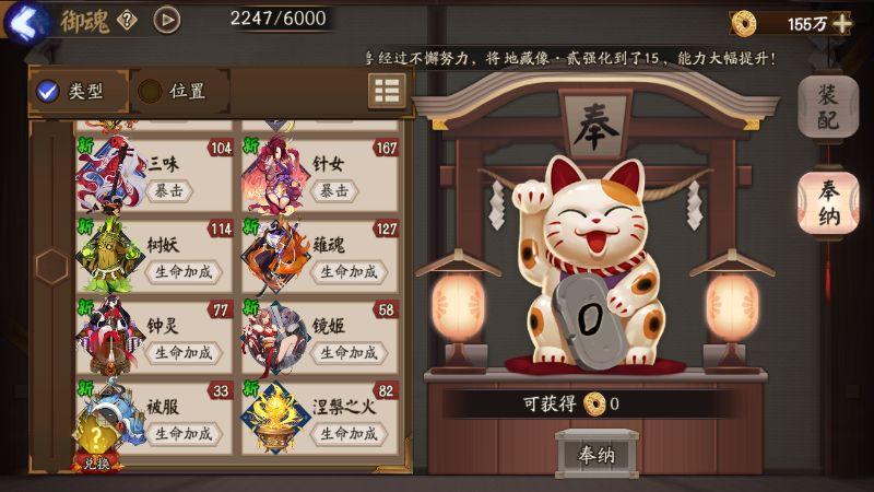 〖叁〗、奉纳功能是体验服先爆料的玩法,由于大家也不清楚它,小编在这里为你介绍奉纳功能作用:进入方式:打开御魂界面,点击奉纳,可以看到新增的招财猫。把左边的丢进去即可换取金币了。功能介绍: 这是回收途径,为了让堆积的无用御魂有所去处,多余的可以在御魂界面找招财猫批量奉纳得到金币。