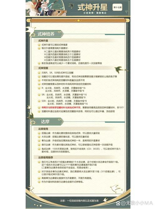〖贰〗、在阴阳师游戏中,快速提升式神至六星的方法之一是关注活动中的极速育成。在特定活动中,玩家可以选取一个指定品阶的式神进行极速育成。由于活动内容不同,可以急速育成的式神品阶也会有所不同。通过这种极速育成方式,不仅可以减少式神升星所需的资源,还能在升星时将式神的技能等级提升一级。
