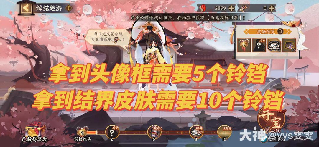 阴阳师缘结趣游活动玩法攻略 50勾玉一张门票,活动期间花合战每天能给一张门票,合计能给7张。消耗门票去抽奖励,我们需要抽到十个铃铛来拿到结界皮肤(20风姿),中途还可以拿个头像框。(10风姿)能否抽到铃铛完全看脸,可能十抽一个都没有,也可能十抽好多个,正常就是十抽1个铃铛。