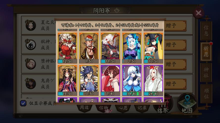 当与好友的羁绊值达到三阶时,便能在阴阳寮的祈愿界面中进行无偿捐赠碎片的操作。这意味着,不仅你可以将多余的碎片赠送给对方,对方也同样可以将碎片赠给你。这样一来,你就无需特意前往对方的阴阳寮,也可以轻松地与好友交换碎片。在进行碎片交换的过程中,需要注意的是,双方都需要满足一定的条件。