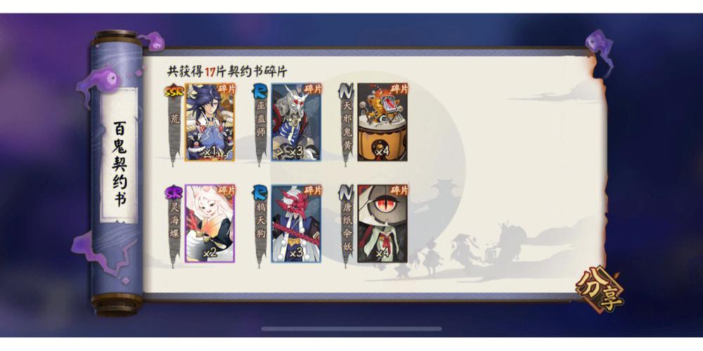 〖叁〗、百鬼夜行,重要的式神碎片来源。随机刷出式神,玩家对想要的式神进行撒豆,有一定概率获得该式神碎片。荣誉商店,可换取SSR式神两面佛的式神碎片。荣誉获取请【点此查看】。剧情任务,完成指定关卡,可获得犬神等出现在主线中的式神的碎片。