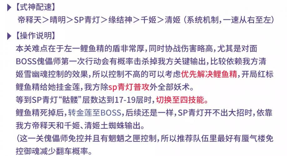 〖叁〗、在阴阳师中,面对傀儡师秘闻副本时,合理的阵容与御魂搭配至关重要。对于高配1—7层,推荐的配速是久食晴明、铁鼠、因幡修。此配置可以有效提升队伍的生存能力和输出效率。当进入高配9—10层及番外副本时,建议采用倒序配速:SP灯帝释天、缘结神晴明清姬千姬。