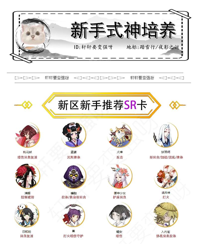 适合新手玩家练习的式神包括:山兔,这是一种前期的拉条R级式神。还有座敷童子,它作为前期的火机R级式神,可以为队伍提供必要的输出。鬼使黑是SR级别的开荒式神,特别是在前期,它能帮助队伍快速提升战斗力。铁鼠则是一个前期的buff式神,它的技能可以削弱敌方防御,为队伍创造有利条件。