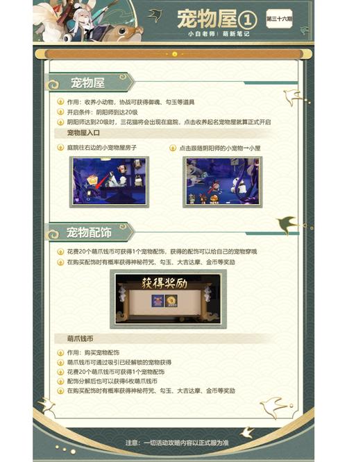 〖贰〗、宠物亲密度提升方法:吸引小动物来到后院后,抚摸它可增加亲密度。当亲密度满,这只小动物会来到庭院,请求你的领养。如果阴阳师大人选取领养,并给它起名,它会成为忠实的朋友们,不离不弃。宠物配饰 在后院中,吸引到满亲密度的小动物,小动物会留下萌爪钱币,用于购买配饰福袋。
