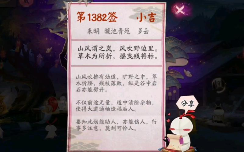 〖伍〗、阴阳师每天一签的末吉签文,虽然预示着一些小小的挑战,但也并非全然不利。以下是一些末吉签文的解释以及对应的解签语录汇总:签文:“寒风水冷隐作痛,鸡犬相闻闹晨曦。”解签:若感觉身体不适,此时应多加保重,静心调养。周围的环境可能有些纷扰,但只要你保持平静,不日将会有好事发生。