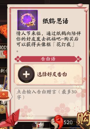 纸鹤思语是阴阳师在2月14日情人节新推出的物品,在商店中花520勾玉即可购买。当点击纸鹤思语时会出现这样一个界面,选取一个好友然后输入相应的表白赠言,点520勾玉按钮购买后即可表白成功。