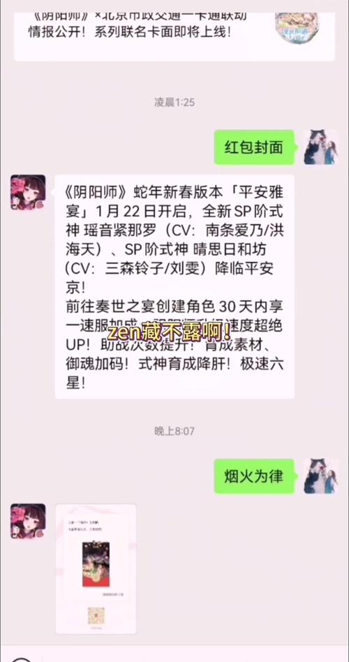 〖伍〗、首先,打开微信并进入聊天界面,找到阴阳师手游的官方公众号。点击关注后,向公众号发送特定的消息,例如“#阴阳师”。这样操作后,公众号会自动跳转到一个专属活动页面。在这个页面上,用户可以直接看到阴阳师限定的红包封面展示,各种设计独特、与游戏主题紧密相连的封面跃然眼前。