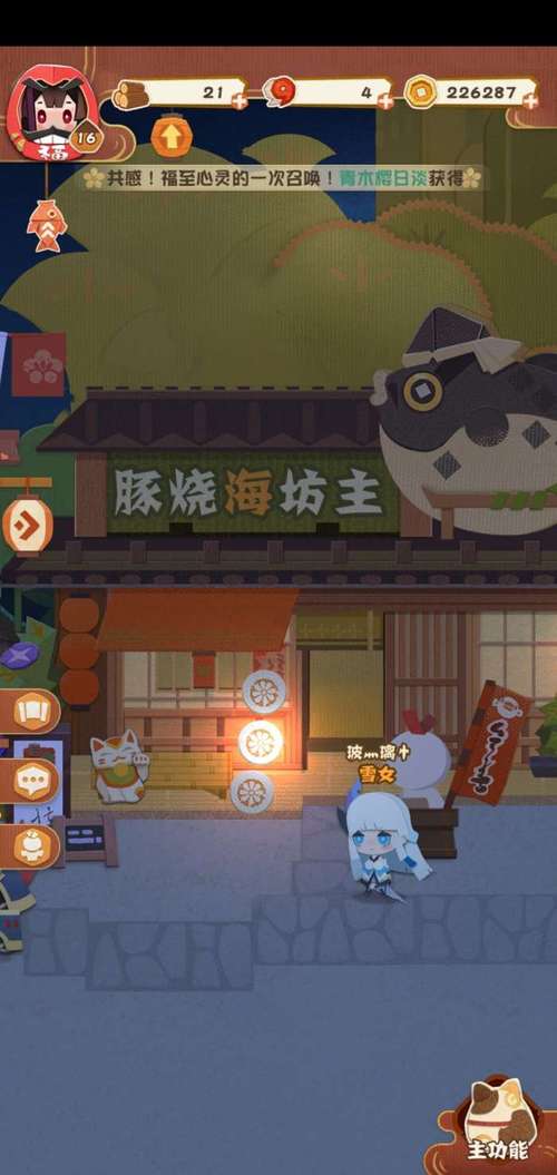 庭院互动彩蛋:例如,将九命猫放在小胖猫旁边模仿猫的行为,或将涂壁放在地藏像旁边,可以触发特定的互动。招财猫居酒屋门口的招财猫,频繁点击可获得打折券。樱花妖和桃花妖荡秋千,河童在小河潜水,会触发成就。点击庭院树,有时会出现意外惊喜。