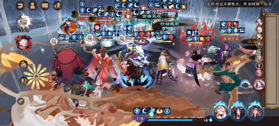 对方有拉条,阎魔直接按掉;没拉条,直接进鬼吞回合。鬼吞推条,山风2技能选对方核心破防(优先sp荒川,帝释天,sp面灵气,千姬等核心式神)平a,如果有食灵的话给山风喂饭,八岐大蛇拉山风再标记另一个破防,然后平a炸盾。一目连第一轮先平a,然后神乐拉一目连给山风2盾炸第二次。