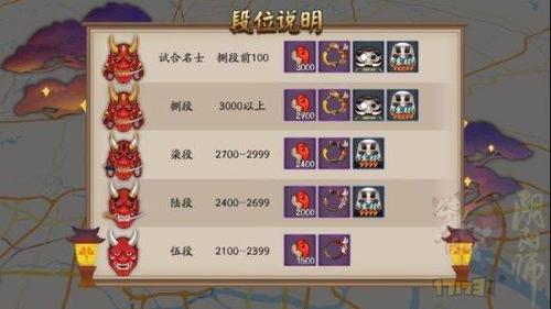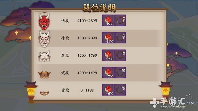 〖伍〗、—13:00 ,21:00—22:00(中午晚上各一个小时)。系统匹配积分接近的玩家即时战斗,胜利获得积分,失败损失积分。段位为四段及以下时,每位阴阳师需派出3名式神参赛。段位达到五段及以上时,每位阴阳师需派出5名式神参赛。每周日晚24:00发放周奖励,同时重置段位。