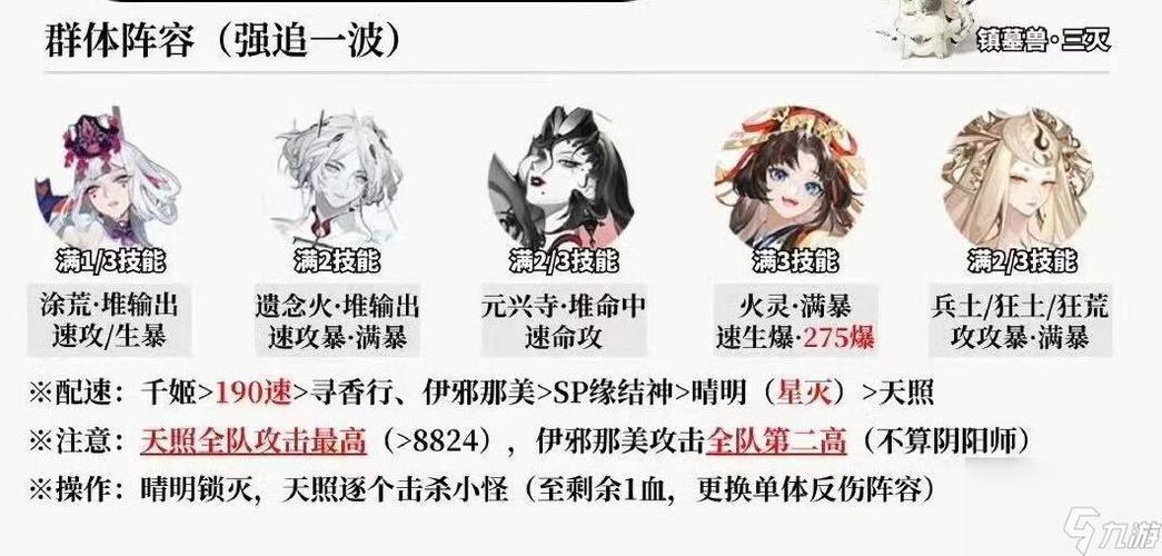 〖叁〗、双拉双输出,小编推荐玉藻前+荒+镰鼬+山兔+辉夜姬。在金币加成关卡层记得开金币双倍+铁鼠。