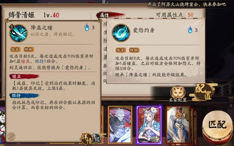 〖叁〗、久次良:破势,速攻暴/暴伤,满暴优先。SP金鱼姬:薙魂,攻攻暴/暴伤,满暴优先。【替补式神】日和坊:树妖,生生暴/暴伤,满暴优先。星熊童子(兵俑/清姬/小松丸):薙魂,速命生/防,命中优先。阎魔:散件一速即可,至少快过大蛇。大岳丸:破势,攻攻暴/暴伤,满暴优先。