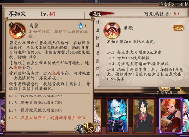 不知火需要升满级,普攻和被动技能至关重要。满级大招提供“先机”,无视防御的吸血、根据鬼火数量加伤害,两次普攻概率100%。不知火作为限定式神,技能本身非常强力,建议全部升满级。二技能「离影」是不知火的输出来源,不论打活动、封魔、斗技,不知火一般都是半输出或者纯输出的。
