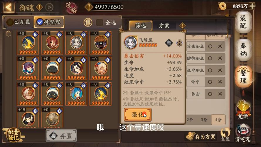 阴阳师缘结神御魂怎么配置 4招财+2暴击:一套很常用的御魂阵容,选取招财辅助流,主属性速攻爆,可以增伤持续作战;再加上斗技配合招财,保证己方血量,类似于回血加伤害的共同作用,还能提供庇护推条等效果,这套搭配在战斗中非常实用。