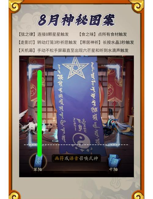 触发效果:成功触发该神秘图案后,可以获得1张神秘的符咒作为奖励。这个奖励每个月只能领取一次。召唤意义:召唤是游戏中获取式神的主要手段,而每月的神秘图案是游戏中为玩家提供的一种额外奖励机制,样式会定期更新,奖励也会刷新。