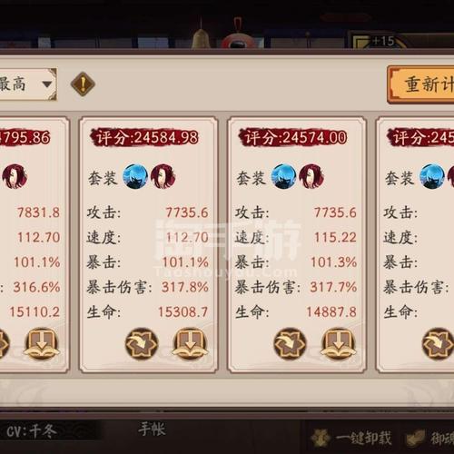 双紧那罗:这是核心输出单位,第一只紧那罗携带轮入道和荒骷髅套装,追求速度和暴伤,确保一速和满爆。 蝎女:攻击越高越好,携带招财、攻攻攻御魂。 sp清姬:追求低速度,携带涂佛和荒骷髅套装,以叠加涂佛效果为主。 缘结神:携带生生爆击和招财套装,满爆即可。