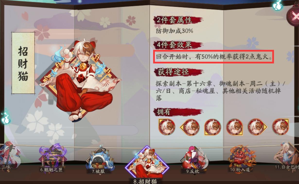 〖叁〗、阴阳师手游招财猫御魂解析攻略: 2件套属性:提供30%的防御加成,对于需要一定防御力的式神来说,是个不错的选取。 4件套属性:回合开始时,有50%的概率获得2点鬼火。这可是个看脸的属性,不过每回合都有机会触发,算是比较稳定的鬼火来源。