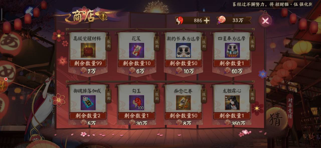 〖陆〗、觉醒SSR式神需中级*8+高级*16。刷副本平均每次获得2个低级材料,觉醒一个SSR式神所需的体力一周可能都无法完成。提升材料获得效率的方法在于提高副本层数,因为层数越高,获得高级材料的几率越大。推荐刷至第七层,配置如下:晴明:山兔+椒图+莹草+座敷童子+姑获鸟。