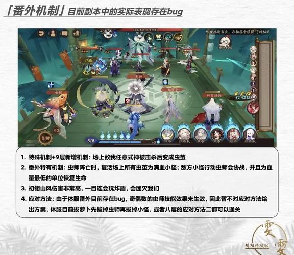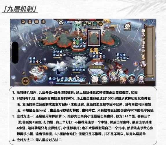 阴阳师虫师秘闻第九层打法攻略除特殊机制外,九层开始-番外增加机制:场上敌我任意式神被击杀后变成虫茧,如图9层特有机制:虫茧保留初始生命的50%,场上虫茧生命值达到100%时继承式神初始状态并复活。