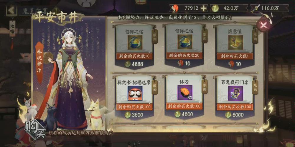 全奖励所需材料汇总:平安市井硬币: 这是活动的主要货币,通过完成任务、挑战副本等方式获得。活动道具: 包括各种符咒、达摩等,用于兑换奖励或提升活动角色的能力。御魂材料: 强化御魂所需的材料,可以通过活动副本或商店购买获得。式神碎片: 收集一定数量的碎片可以合成完整的式神,增强你的式神阵容。