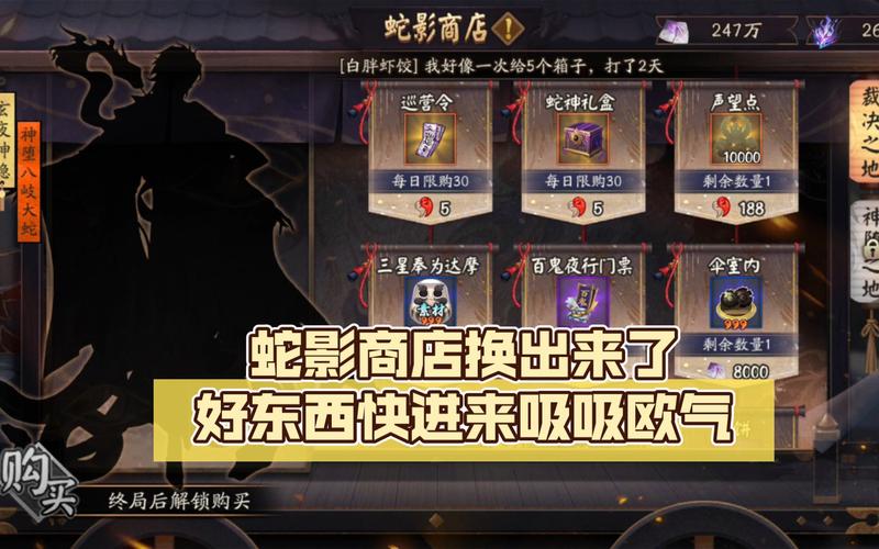 〖贰〗、阴阳师游戏中,蛇影商店位于主界面的右下方,点击此图标即可进入。进入后,商店内包含多种物品,供玩家兑换。商店具体分为裁决之地与神堕之地两个区域。裁决之地主要提供一些消耗品和道具,比如御魂、符咒等,玩家可根据自身需求选取兑换。神堕之地则侧重于角色装备和技能书等,帮助玩家提升战斗力。