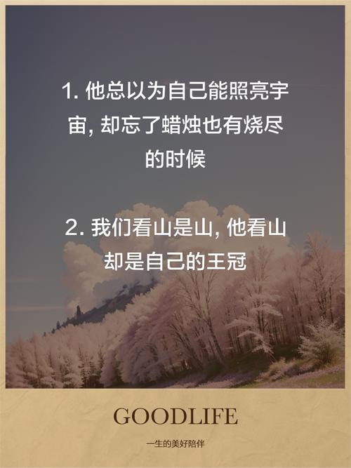 〖叁〗、人最相信的是自己,因此每个人都有点自大狂。但人最不相信的也是自己,因为他们无法简单地与自己相处。 人不能有傲气,但不可无傲骨。傲气与傲骨之间往往只有一线之隔,常人很难做到收放自如、毫不越界。傲气是骄傲自大、盛气凌人,一定要戒掉这个坏习惯。