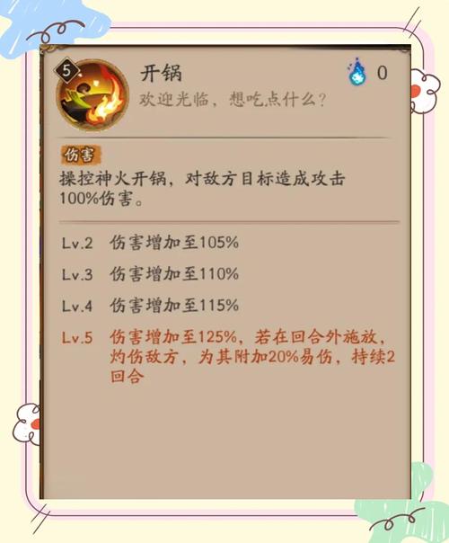 技能解读 【开锅】一技能升至5级后,可以使食灵回合外施放时,比如协战的时候,给敌方附加20%易伤,以便我方核心输出式神更高效的破核。