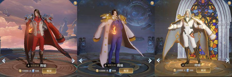 〖叁〗、王者荣耀中,周瑜共有四款皮肤,分别是海军大将、真爱至上、赤莲之焰和音你心动。海军大将作为周瑜的第一款皮肤,其设计灵感来源于海军主题,周瑜身着蓝色军装,头戴军帽,手持指挥棒,显得英气逼人。