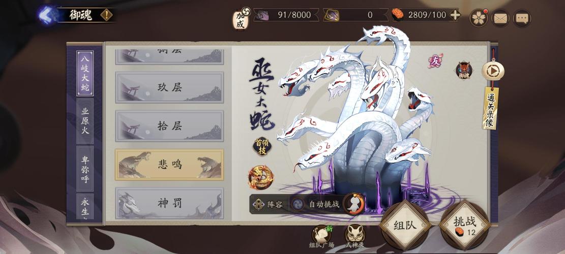 〖肆〗、掉落奖励:层数越高,6星御魂的概率越大(小编通过3层和6层,奖励都只有1个6星)、噬剑之蛇头像框(通过7-9层有极小概率获得,10层概率高点)上场配置:我方5个式神+阴阳师(3个人组队的话,队长出一个式神+阴阳师,队友出2个式神,剩下的式神在休息区),敌方一个真八岐大蛇+4个式神。