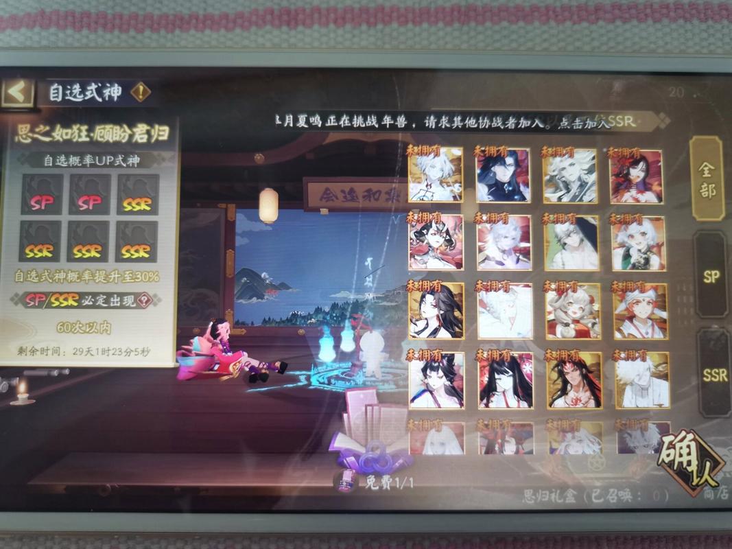 自9月15日起,对于那些超过30天未登录的阴阳师大人,当他们重返平安京时,将享受到特别的思归召唤活动。在活动期间,通过召唤,SSR/SP式神将被收入思归礼盒中。玩家可以根据自己的喜好,将心仪的SSR/SP式神放置在相应的奖励位置。每个奖励可以通过使用思归灵石来解锁。