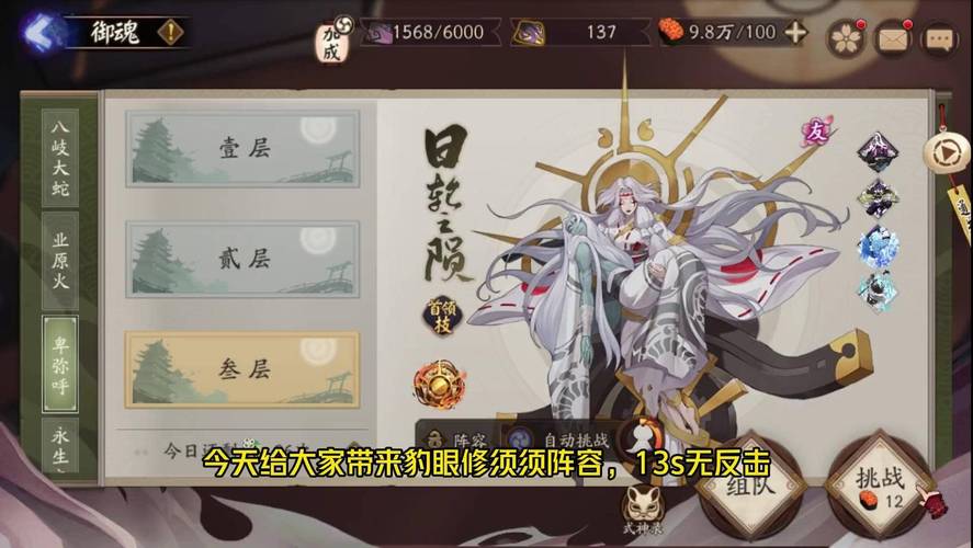 挑战时间:9月14日9:00-9月17日23:59,进入瞭望塔-日轮之陨即可挑战卑弥呼。卑弥呼之战没有排名系统,大人们共同击败卑弥呼之后将会解锁商店的SP/SSR召唤券的兑换资格。第一阶段 阵容推荐:蛇*妖琴*输出祭品、疾风神乐。全员246属性为攻击、攻击、暴伤。
