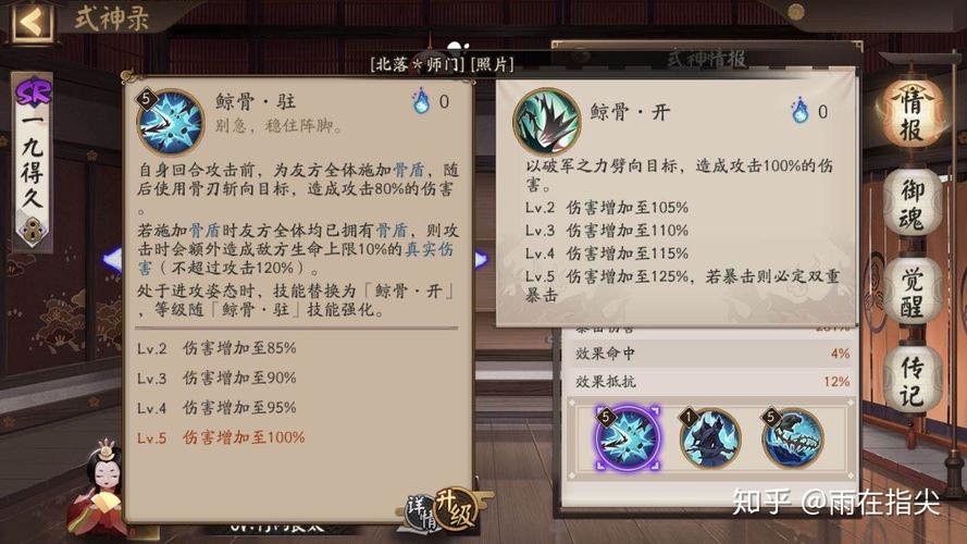 - [高级天雷鼓] × 8 久次良式神技能 一技能:鲸骨·驻/鲸启顷答骨·开(普通攻击)- 消耗鬼火数:0 - 技能效果:在自身回合攻击前,为友方全体施加骨盾,随后对目标造成攻击80%的伤害。若施加骨盾时友方全体均已拥有骨盾,则攻击时会额外造成敌方生命上限10%的真实伤害(不超过攻击120%)。