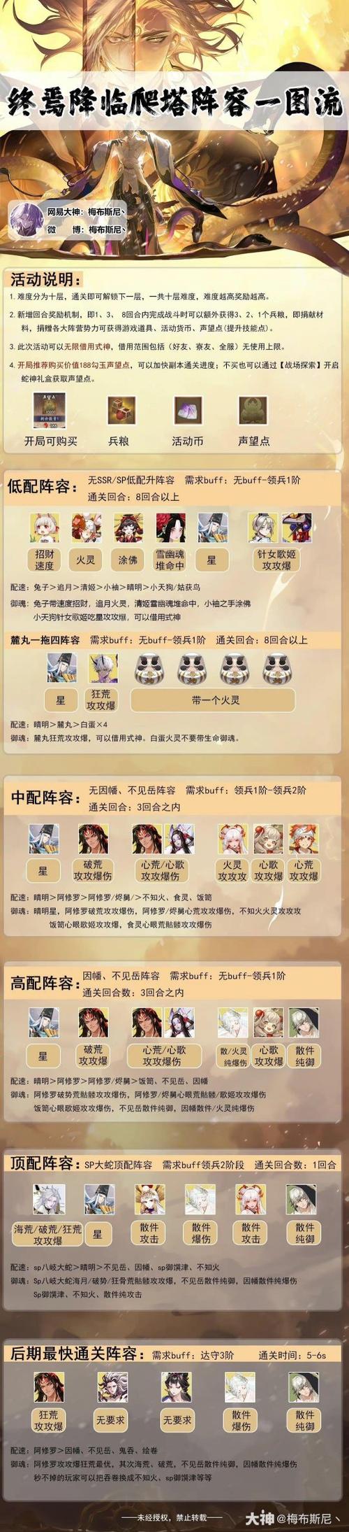 阵容推荐: 晴明 - 作为阴阳师,晴明能够为队伍提供稳定的控制和辅助。 SP八岐大蛇 - 作为核心输出,SP八岐大蛇能够利用其技能造成大量伤害。 因幡辉夜姬 - 作为辅助式神,她的速度和攻击力能够提升队伍的整体表现。 不见岳 - 提供额外的辅助效果,增强队伍的生存能力。