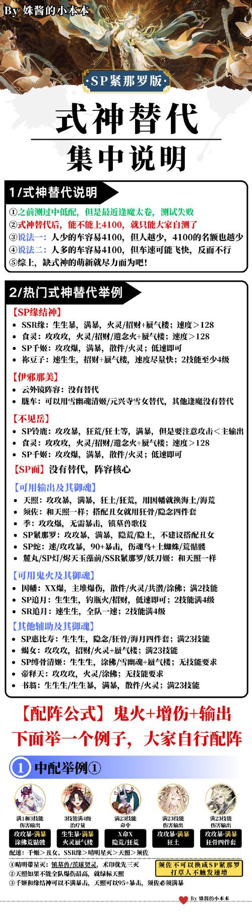 个骨女(输出)1个大天狗(输出)1个狗粮式神(如三尾狐等) 阵容打法 在战斗中,首先需要让狗粮式神吸引敌人的攻击,同时铁鼠和鬼使黑进行治疗。骨女和大天狗则是核心输出,在消灭敌人时贡献极大。需要注意的是,如果狗粮式神死亡,则需要尽快进行复活。否则,敌人会攻击其他队员,造成极大的伤害。