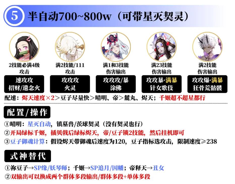 白藏主:坐地必备,常用御魂木魅/蚌精/招财。 阎魔:阴阳师最快速度,斗技必练,常用御魂散件/火灵/木魅/蚌精/招财。 彼岸花:控制式神,即使对方有蚌精也可以去控他第二轮,常用御魂钟灵/魅妖/狂骨/心眼。 小松丸:ban吞队的T0级别控制,控制还能顺便封被动,常用御魂招财/蚌精。