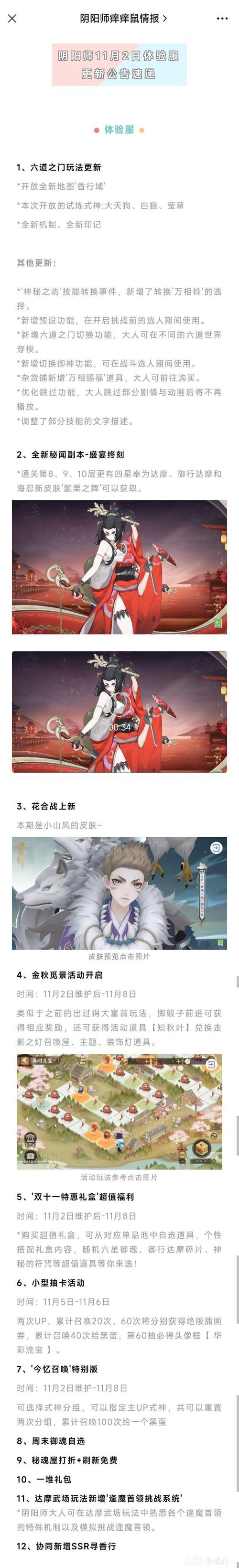 阴阳师7月7日体验服更新内容如下:神龛调整 对返魂时可获得35御札的式神设定了每天返魂次数上限3次的限制。7月16日神龛将新增商品项[御魂礼盒],花费200御札可兑换指定位置指定种类的6星御魂1枚,每个周期限定比较多兑换5枚。神龛可以查询下面一期的商品。