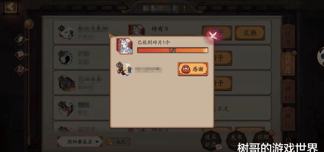 〖陆〗、在阴阳寮中,玩家可以体验到独特的祈愿系统。通过点击祈愿按钮,玩家进入阴阳寮的祈愿界面。在这个界面中,玩家能够将自己不需要的碎片赠送给有需求的寮友,同时发布自己所需要的碎片。此外,玩家还可以通过世界频道与其他玩家取得联系,进行碎片交换。