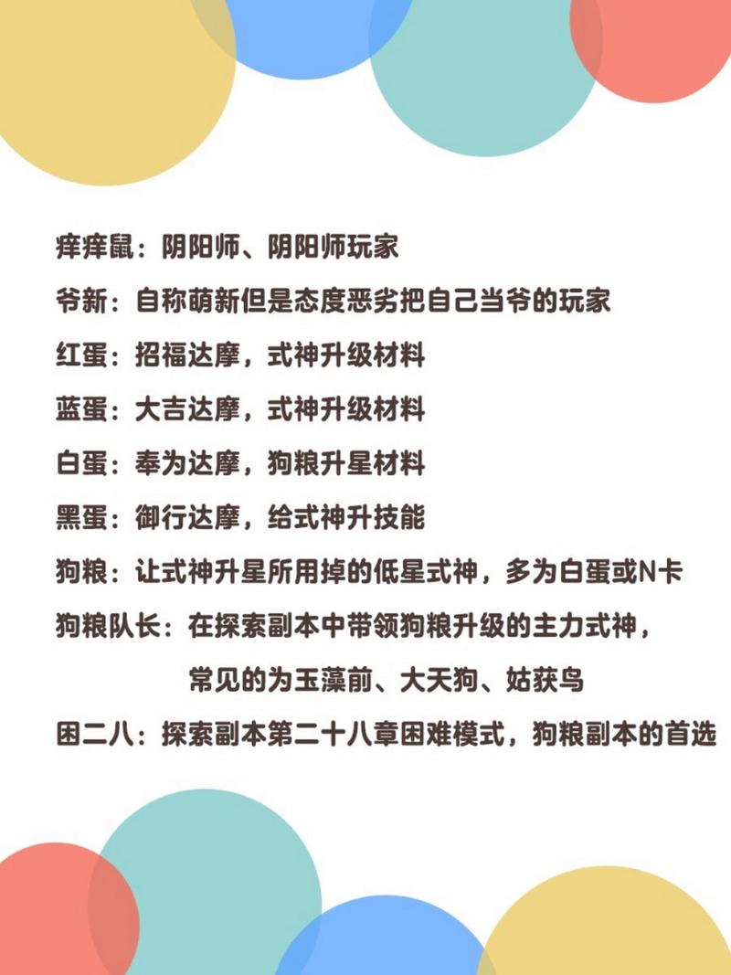 阴阳师常见游戏术语解释汇总萌新入坑进圈宝典痒痒鼠:阴阳师(YYS)的拼音首字母的智能联想屯屯鼠:喜欢收集,数据比较好看。囤勾玉囤金币之类的玩家秃驴师:肝度非常大导致连头发都没有剩下的阴阳师们林冲:没有氪金,零氪的玩家。