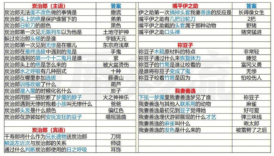 祢豆子回复体力的方式是通过B.睡眠。 不会使用水之呼吸的角色是C.我妻善逸。 拥有特定思维特征的角色是A.富冈义勇。 炭治郎的日轮刀颜色是A.黑色。 炭治郎在炭之家遇袭时,因为A.去镇上卖碳而逃过一劫。
